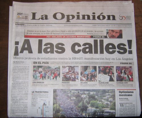 the spanish language newspaper in LA, headlines with "A las calles!",