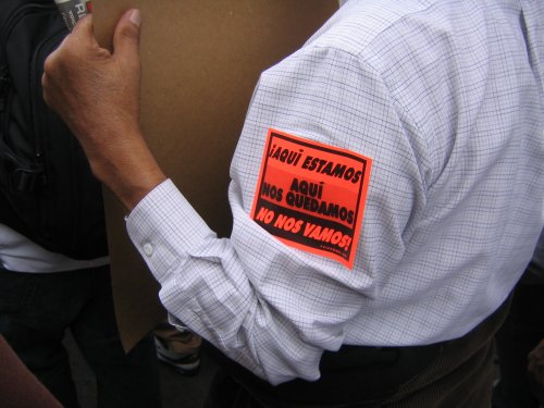 Everywhere there are chants of "Si, Se Puede" and "El Pueblo Unido , Jamas Sera Vencido." While there are some of the pre-printed signs made by the organizers, most carry homemade signs or have written messages on their white t-shirts. Many of the signs say things like “We are not criminals, we come here to work” One teenager had written on his shirt in cholo scrawl “ Aqui estemas, y no nos vamos/ Si nos sacamos, NOS REGRESAMOS!” That was one of my favorites 'cause it's so true!