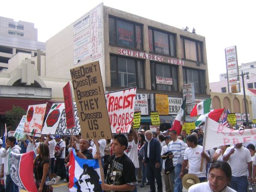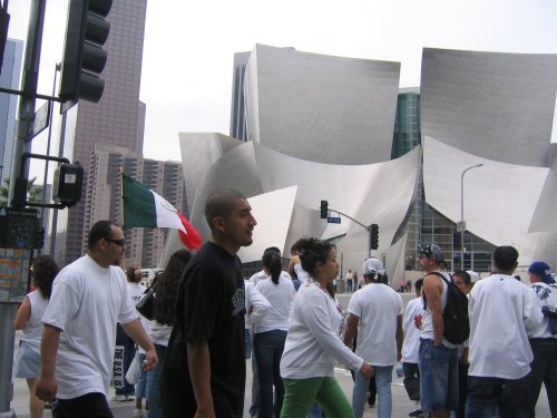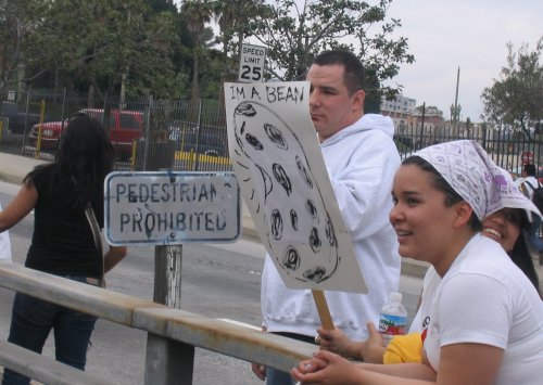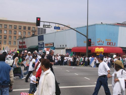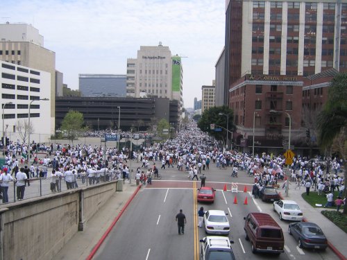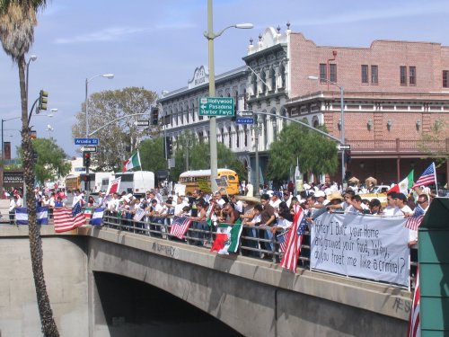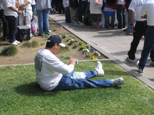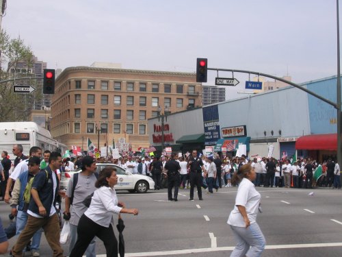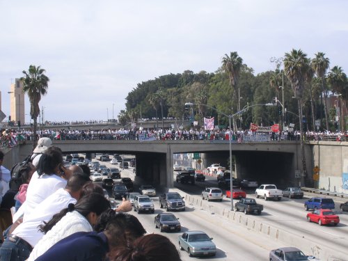 The day before the march, thousands of kids all over LA and outlying counties stage walkouts. In Huntington Park, Bell and South Gate, thousands go from school to school picking up other students. Some students make it out despite the schools being lockdown (yes, the same kind of lockdowns they have in prisons). Residents and business owners offer the kids support and free drinks for their walkout efforts. Many found out about the walkout call through myspace bulletins. I even got one myself.
