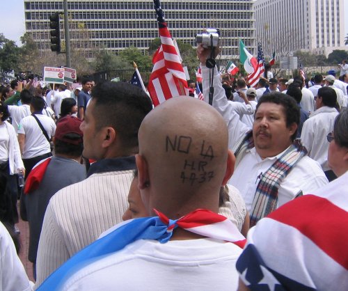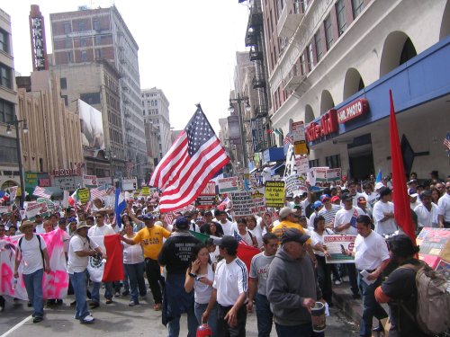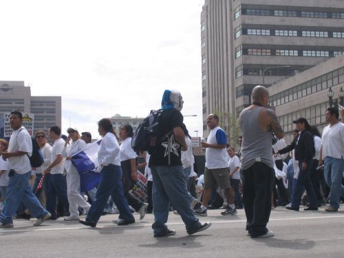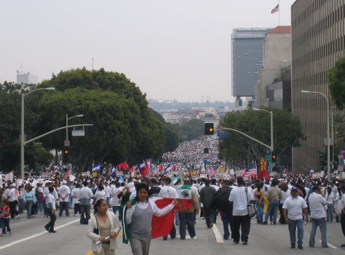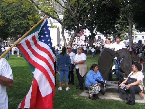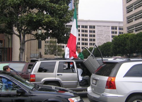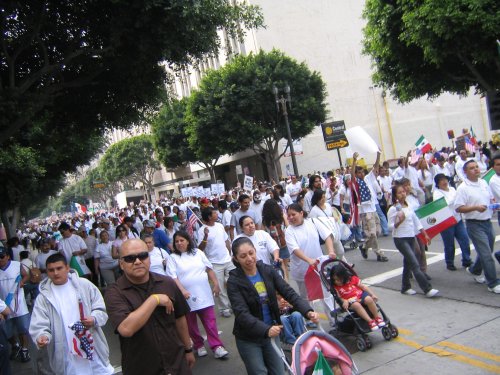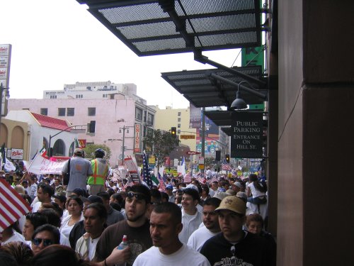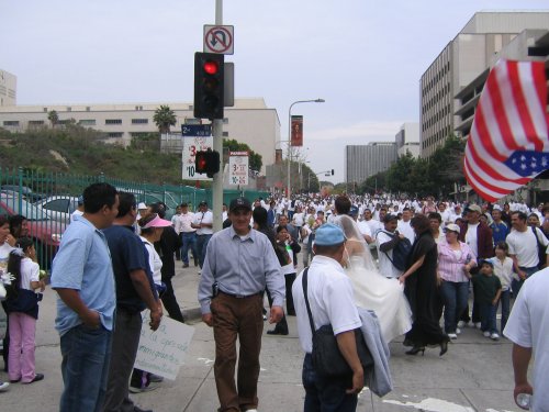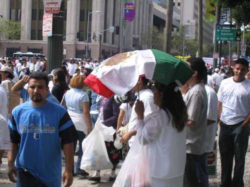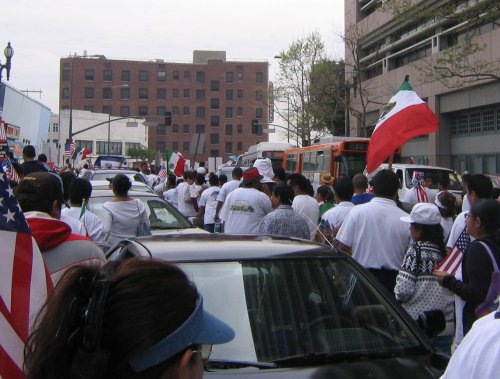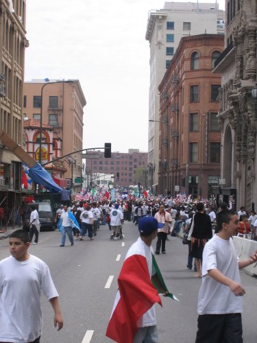Almost everyone in the march is Latino. Mexican, Salvadoran, Guatemalan and Honduran flags waving everywhere. Other countries not really represented. American flags seem to be the flag of choice thanks to the recommendation of the Spanish language radio. In fact, I've never seen so many American flags, it was kinda disconcerting.