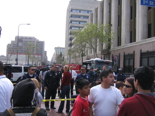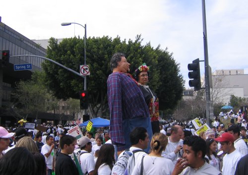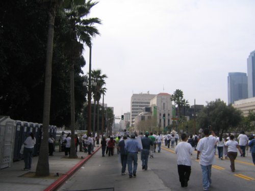 Run into some friends around 2:30 pm, they've just gotten there on the bus. They say folks are still leaving East LA on packed buses on their way downtown and there are busloads of marchers on the buses back too.